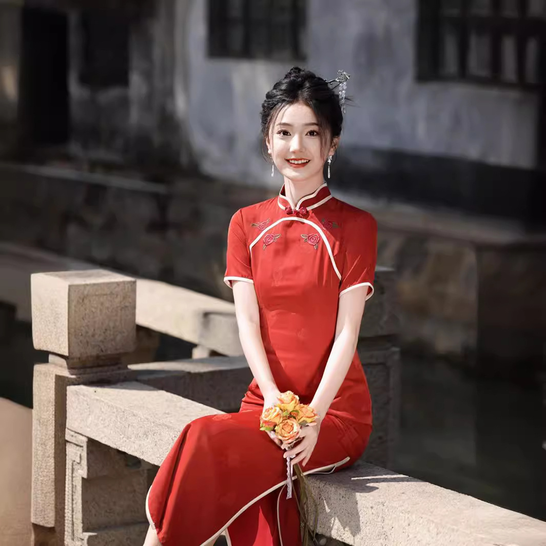 Gaun Cheongsam merah harian dapat dipakai 2024, gaun roti baru musim semi pengantin desain Cina baru gaun pertunangan