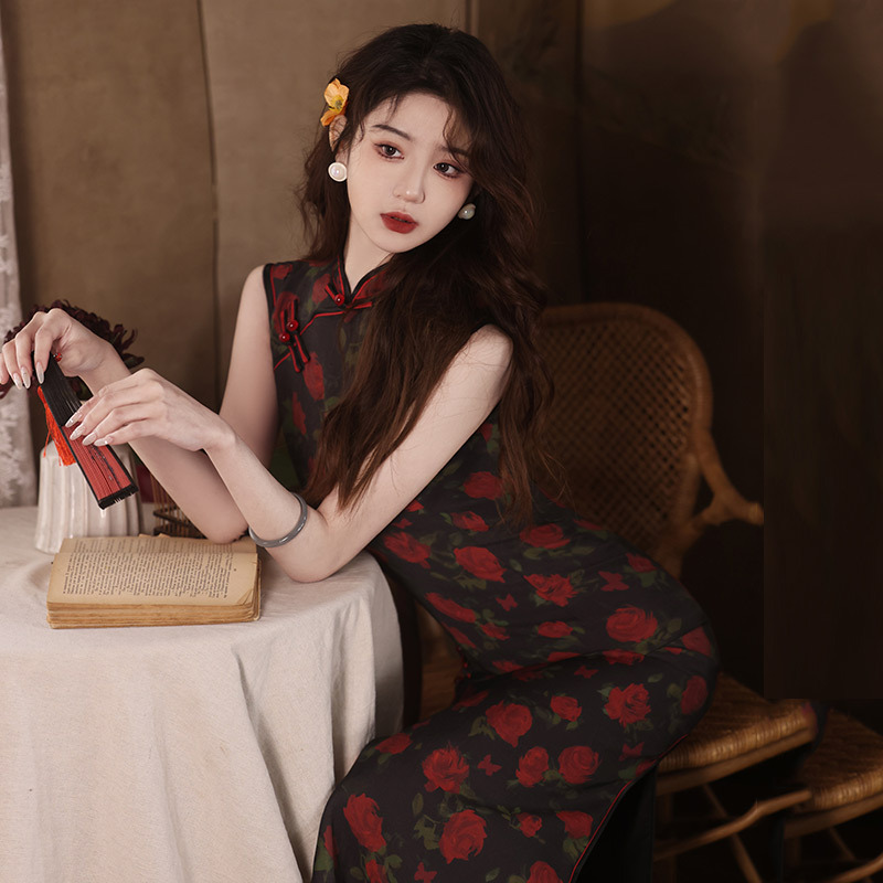 Cheongsam panjang gaya Cina baru kelas atas dengan garis leher asimetris tanpa lengan untuk wanita muda dengan temperamen retro, cocok untuk dipakai sehari-hari.