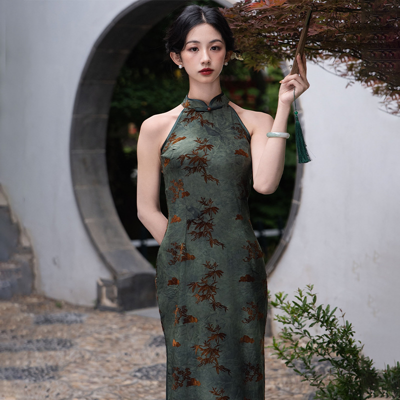Gaun Cheongsam Gaya Cina Terbaru 2025, Model Terbaru, Gaya Nasional, High-End, Hijau, Tanpa Lengan, Model Halter, untuk Pesta.