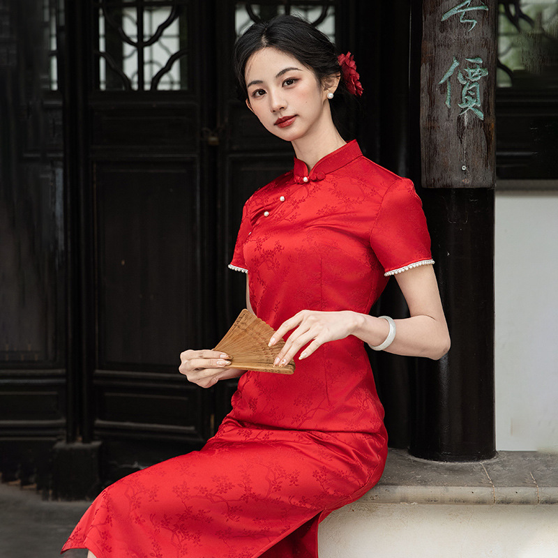 Gaun cheongsam merah bergaya Cina, model terbaru 2025 untuk gadis muda, gaun malam vintage potongan ramping.