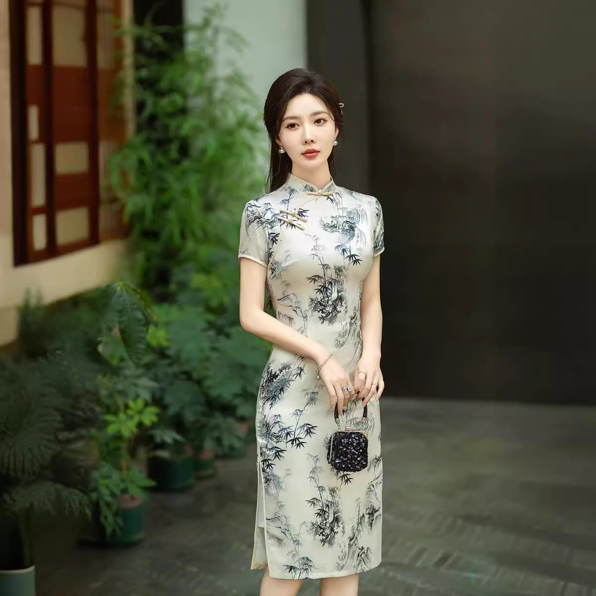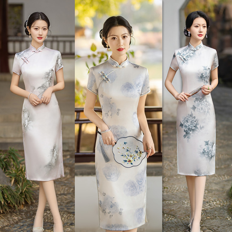 Gaun cheongsam lengan pendek, peningkatan panjang setengah lapisan ganda Musim Panas 2024 gaya Cina baru sutra muda