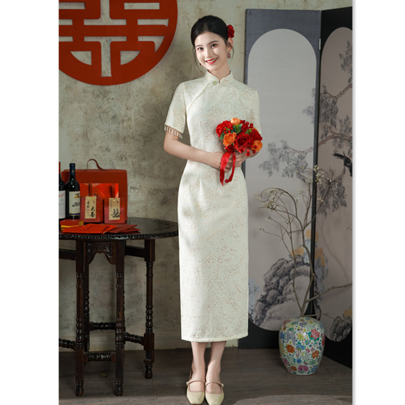 Gaun malam renda cheongsam, dress roti pengiring pengantin gaya China, gaun malam muda cheongsam panjang setengah Musim Panas 2024