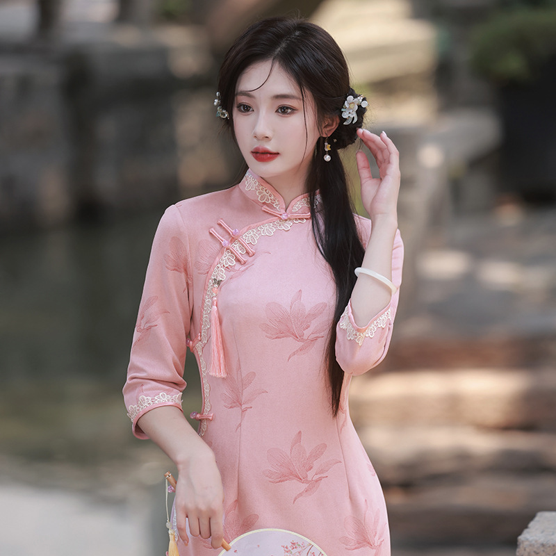 Gaun cheongsam vintage bergaya Cina dengan renda tebal, lengan tiga perempat, berbahan suede timbul elegan kelas atas tahun 2025