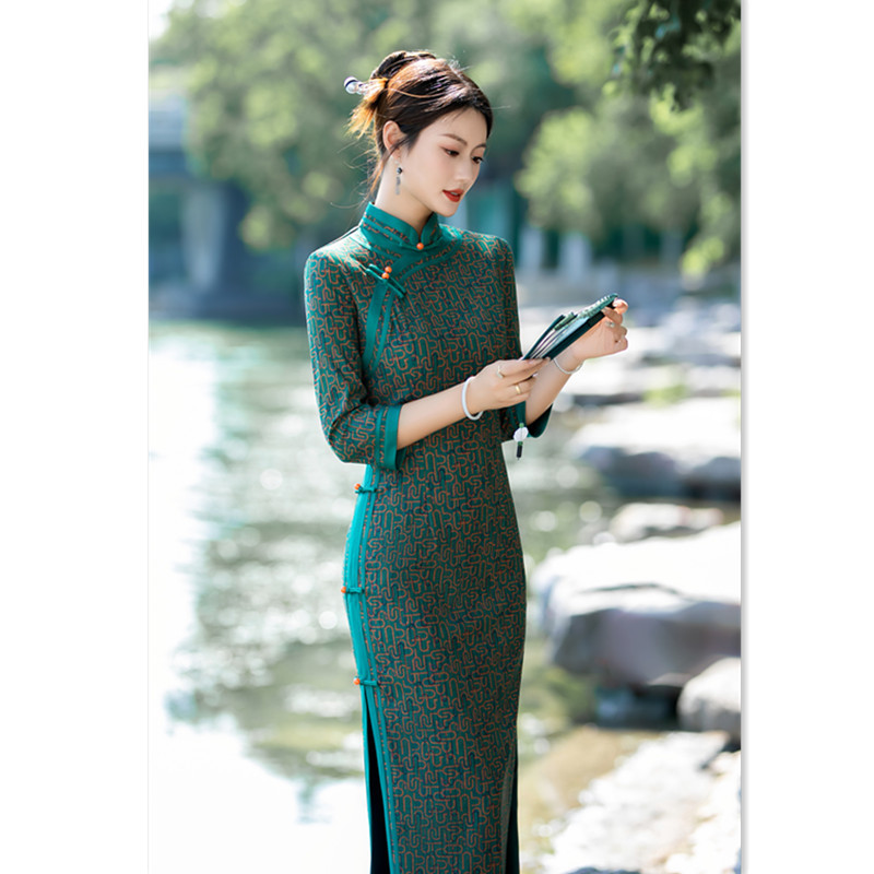 Gaun cheongsam rajutan lengan tiga perempat panjang dengan keliman lebar, model terbaru musim gugur dan dingin 2025, versi modern dan terbaru.