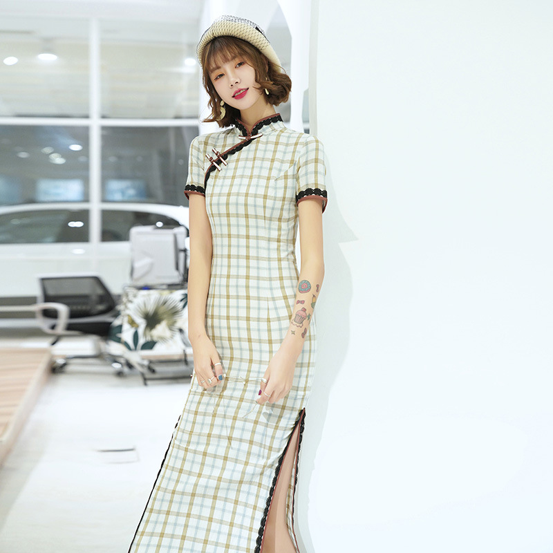 Baju Wanita kotak-kotak gaya Tiongkok kotak-kotak, baju wanita setengah panjang, baju cheongsam, Model Tiongkok, Republik muda perbaikan, Shanghai lama