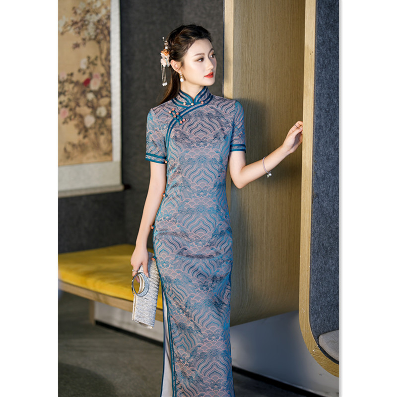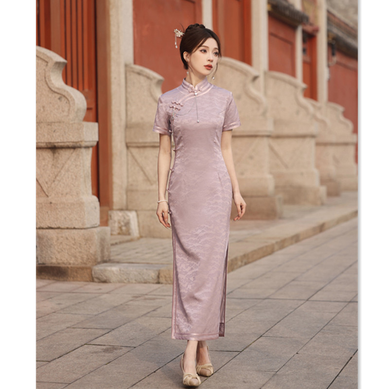 Gaun cheongsam panjang lengan pendek, gaya etnis tradisional, cheongsam lengan pendek, retro baru musim semi dan musim panas, tanda air jacquard