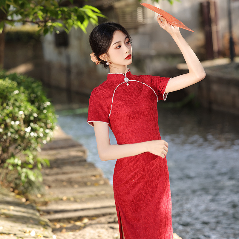 Gaun sifon cheongsam ditingkatkan gaya Tiongkok, pakaian panggang merah renda wanita lembut musim semi dan musim panas