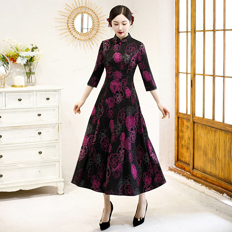 Gaun cheongsam lengan pendek, gaya etnik retro imitasi asetat jacquard panjang 2023 musim gugur dan musim dingin gaya nasional baru