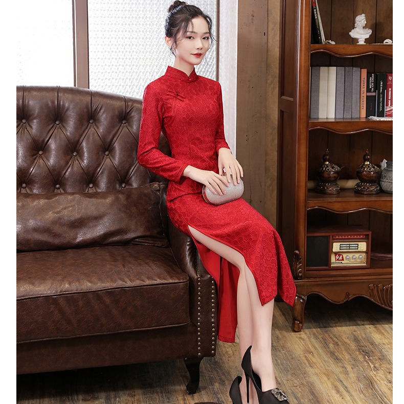 Cheongsam Renda Model Panjang Lengan Panjang Ditambah Tebal Ditambah Beludru Pakaian Ibu Tetap Hangat Model Baru Musim Gugur dan Musim Dingin Gaun Pesta Pernikahan Cheongsam