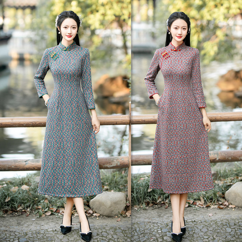 Gaun cheongsam panjang bertepi lebar, gaun cheongsam tiga perempat katun mutiara Shanghai Lama musim dingin 2023 gaya nasional retro tradisional baru