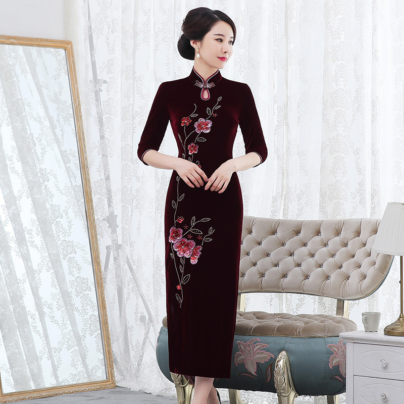 Gaun pernikahan panjang cheongsam, dress ibu meriah cheongsam beludru peningkatan baru ramping retro