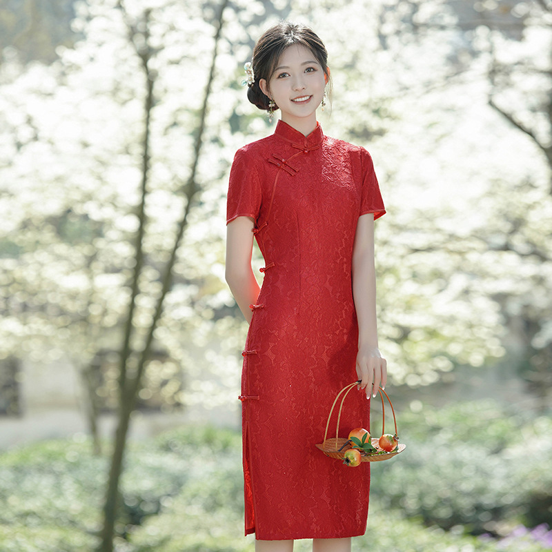 Cheongsam gaun renda ibu muda merah, gaun musim panas untuk wanita kecil baru 2024