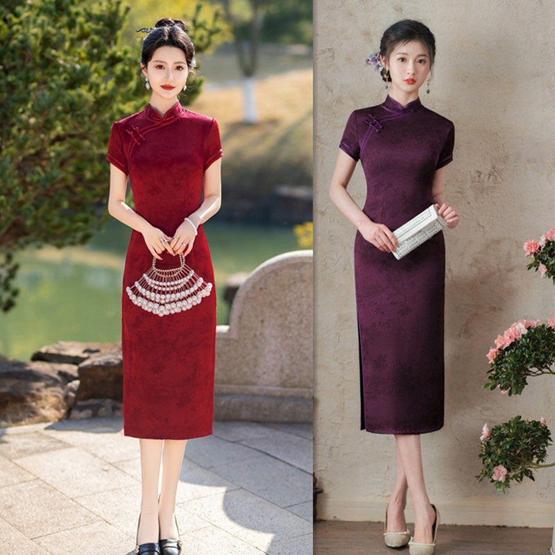 Gaun Cheongsam Beludru Musim Gugur/Dingin 2025 Grosir Suzhou Kasual Pernikahan Retro Beludru Lengan Tiga Perempat.