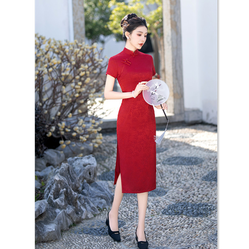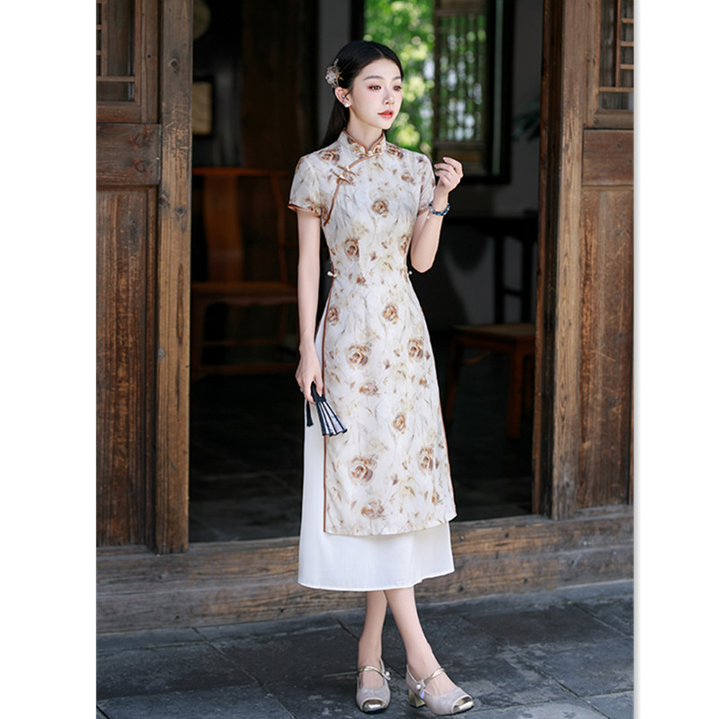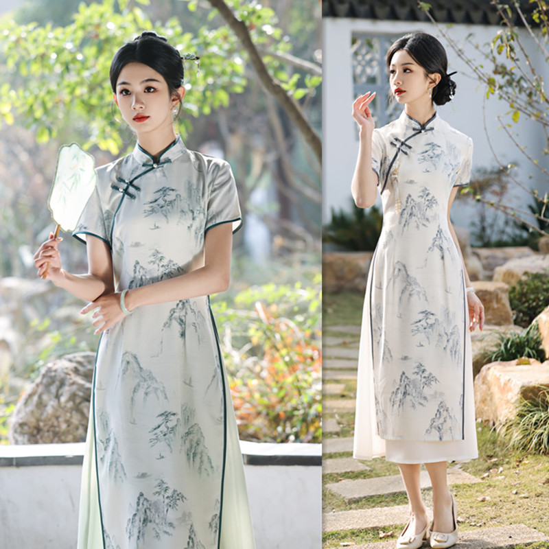 Gaun cheongsam pendek Tiongkok, baju cheongsam panjang dua lapisan, retro gaya China baru musim semi dan musim panas 2024
