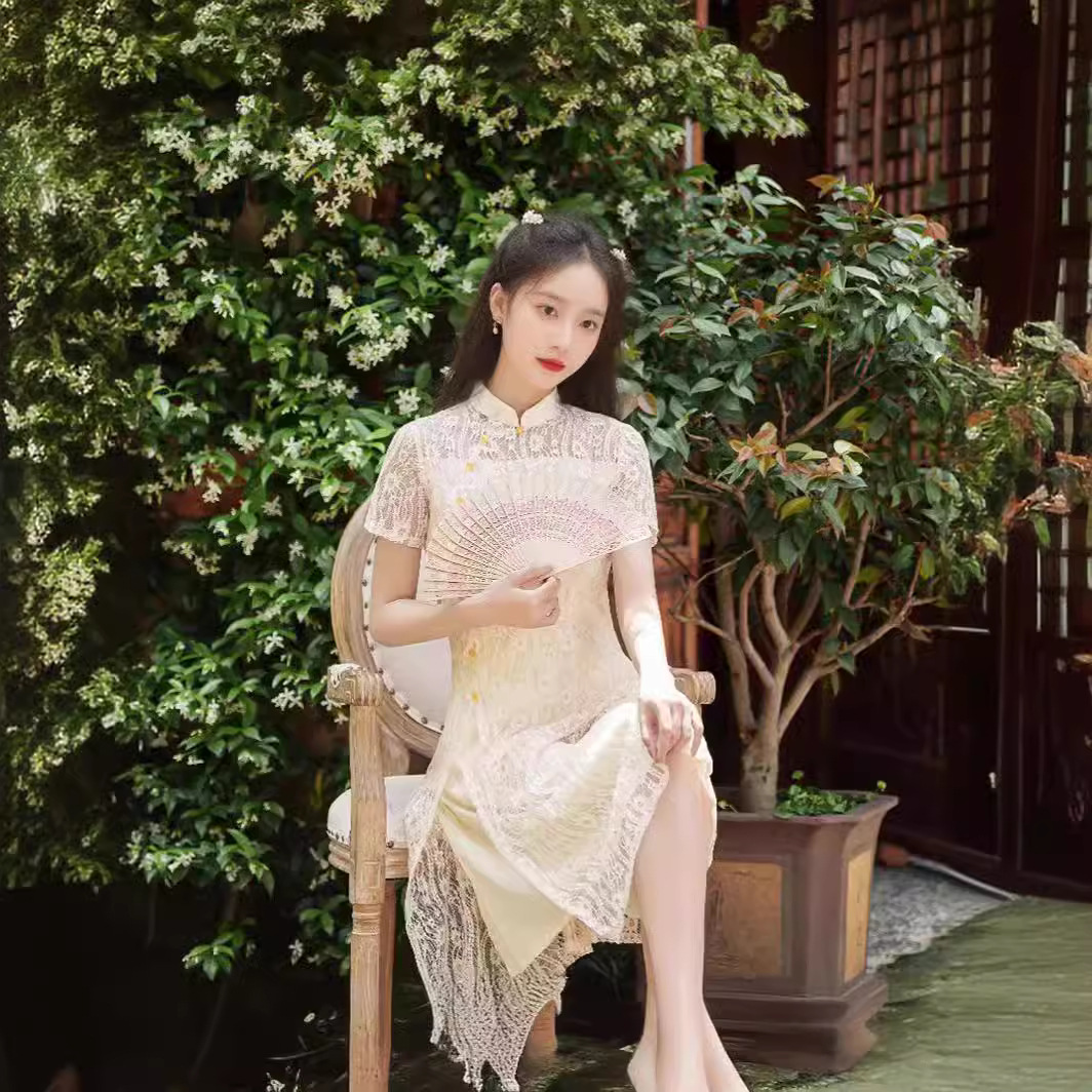 Gaun Ao Dai berenda baru 2026, model cheongsam slim-fit, versi musim panas yang disempurnakan, gaun sehari-hari panjang sedang.