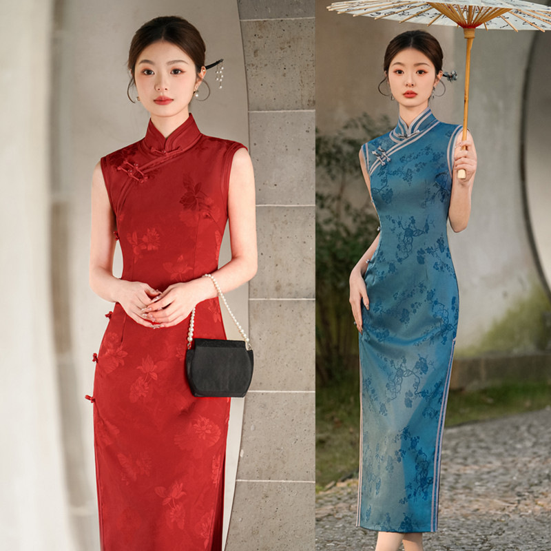 Cheongsam Jubah Sutra Model Panjang Tanpa Lengan Model Baru Musim Panas 2025 Pakaian Bersulang Pengantin Wanita Gaun Pertunangan Merah Gaya Hong Kong Sehari-hari