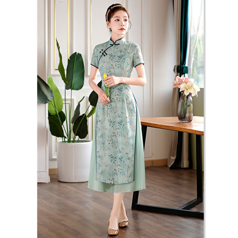 Gaun cheongsam ao dai wanita muda ao dai gaya etnik retro Shanghai lama 2024 musim semi dan musim panas baru