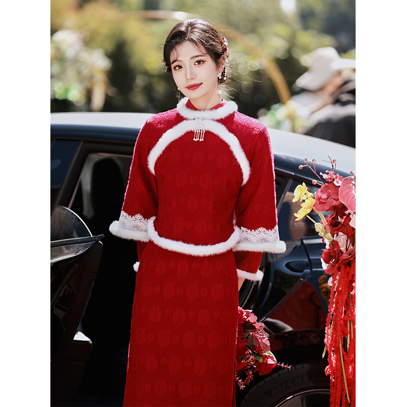 Cheongsam Cina lengan panjang 2023 pengantin perempuan, pesta pernikahan tebal berlapis bulu musim gugur dan musim dingin gadis muda merah ditingkatkan