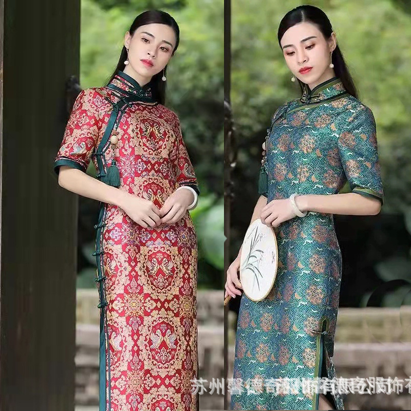 Cheongsam brokat sutra imitasi merah dan hijau, empat model brokat terkenal buatan tangan kelas atas untuk wanita, gaya musim gugur, cheongsam tradisional kelas atas untuk pesta pernikahan.