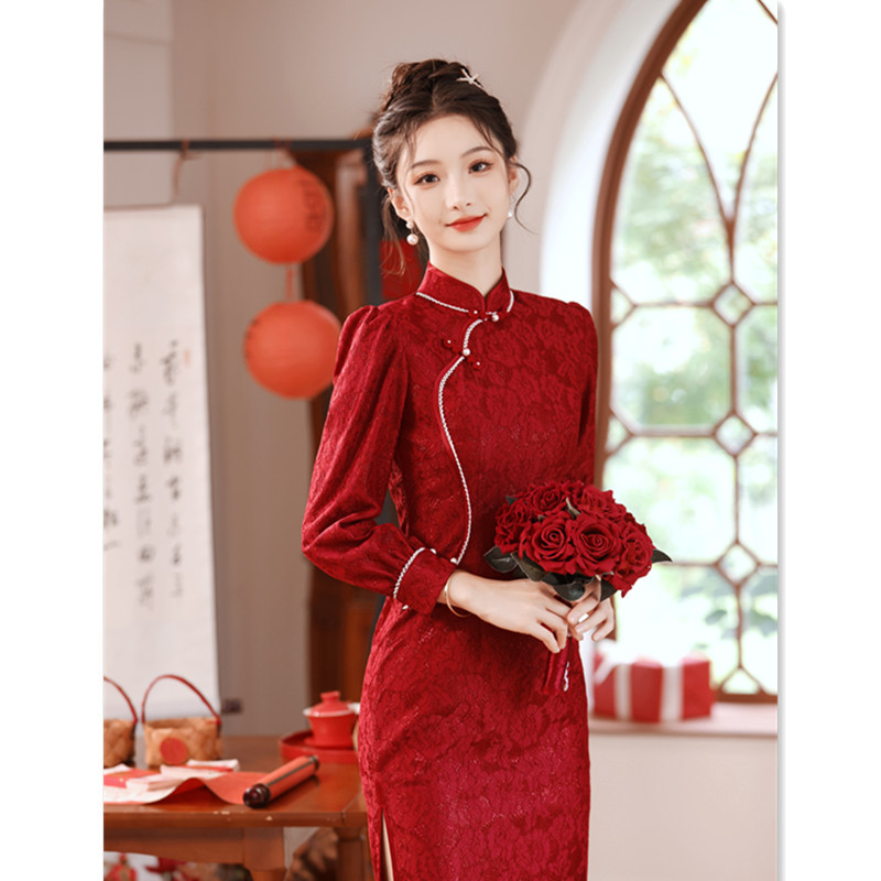 Cheongsam pernikahan pengantin wanita, gaya Cina baru ditingkatkan renda merah musim gugur dan musim dingin baru cheongsam 2023