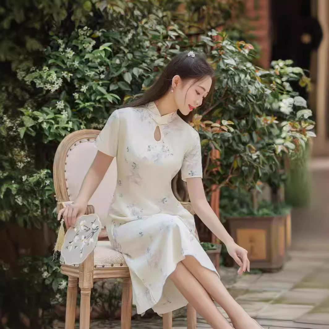 Aiqi bordir cheongsam lengan pendek, gaun cheongsam modis ditingkatkan panjang menengah untuk anak perempuan muda 2024 musim semi dan musim panas gaya nasional baru