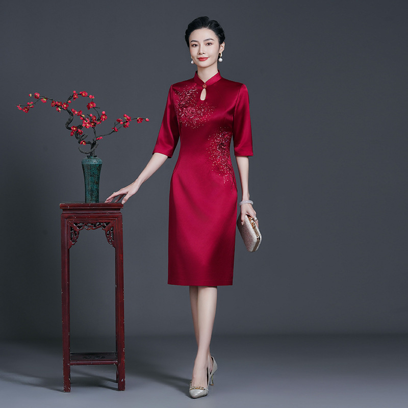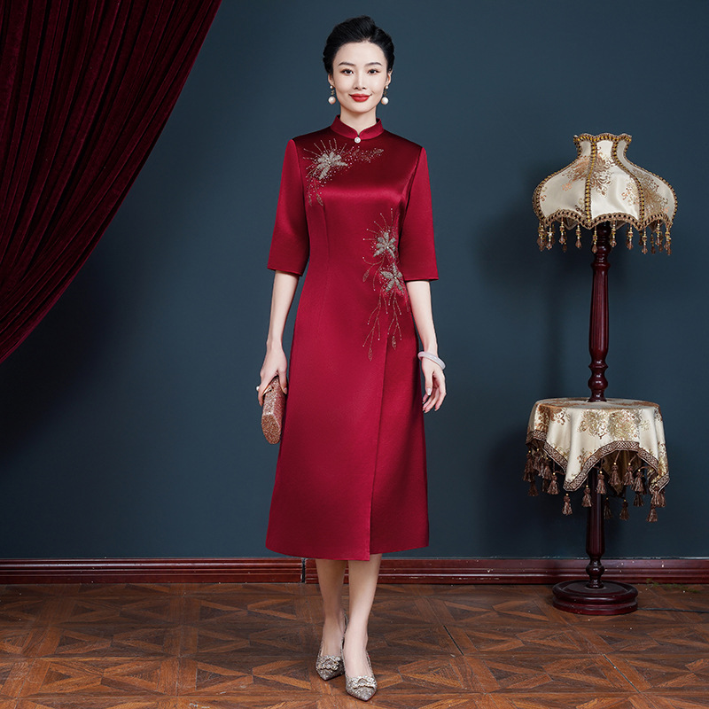 Gaun meriah elegan cheongsam pesta pernikahan ulang tahun dan musim semi musim gugur gaun ketat ibu paruh baya