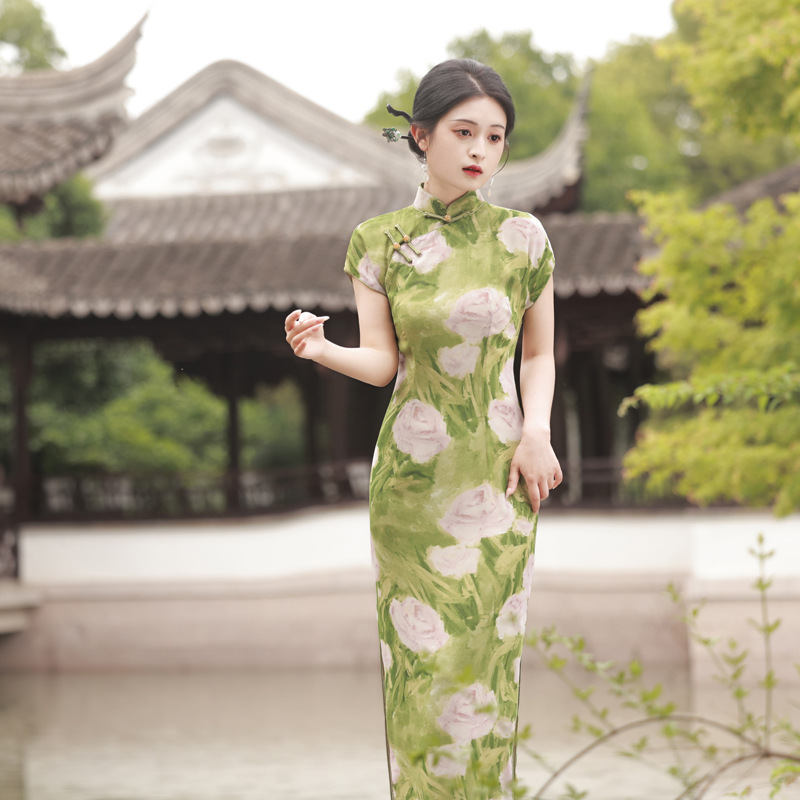 Gaun Cheongsam sutra sutra berat, 2024 lapisan ganda cetak vintage musim semi dan panas 61802