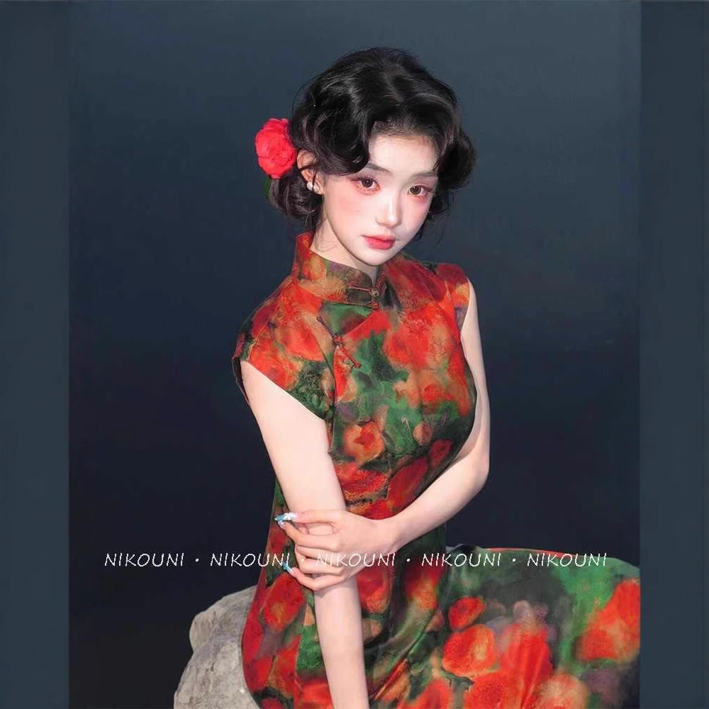 Gaun pelangsing pinggang gaya Tiongkok, kardigan setengah elegan bergaya Tiongkok, gaun cheongsam retro gaya Hong Kong ditingkatkan