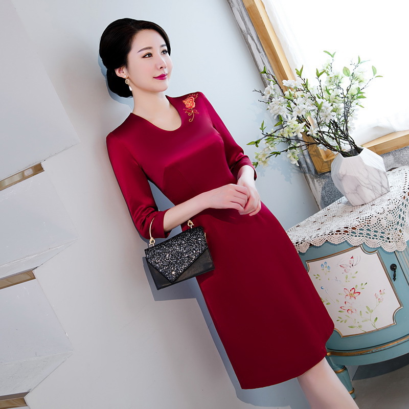 Gaun cheongsam asetat satin baru musim gugur gaun ibu pernikahan pakaian ibu mertua happy mother-in-law pernikahan banquet grosir panjang sedang