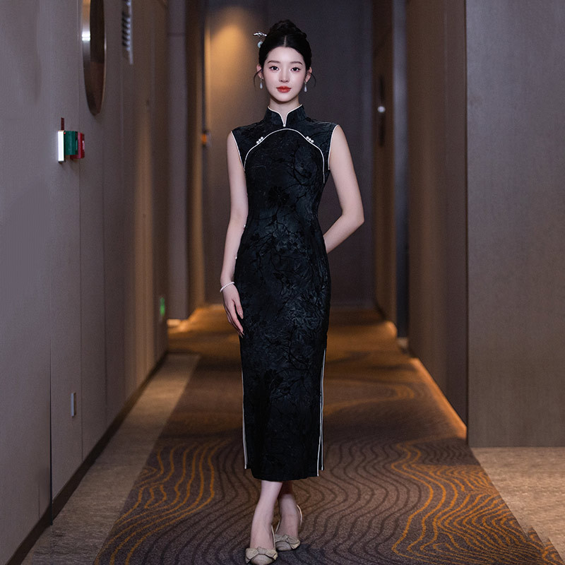 Gaun cheongsam beludru emas, pakaian pertunjukan cheongsam tebal elegan panjang musim gugur dan musim dingin 2023