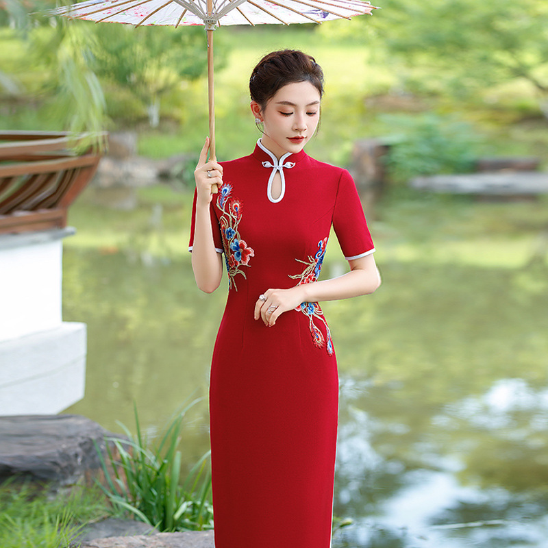 Gaun pesta cheongsam model baru 2025 warna merah bergaya Cina, potongan slim-fit, kerah tegak, lengan pendek, dengan desain phoenix ganda.