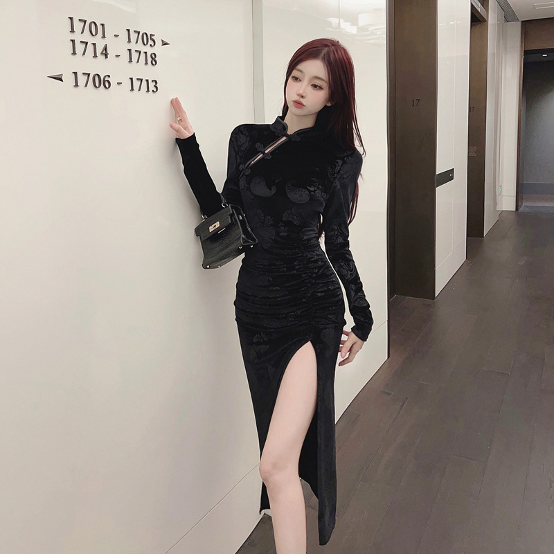 Gaun cheongsam gaya Tiongkok, gaun beludru gadis muda baru musim gugur dan musim dingin 2023