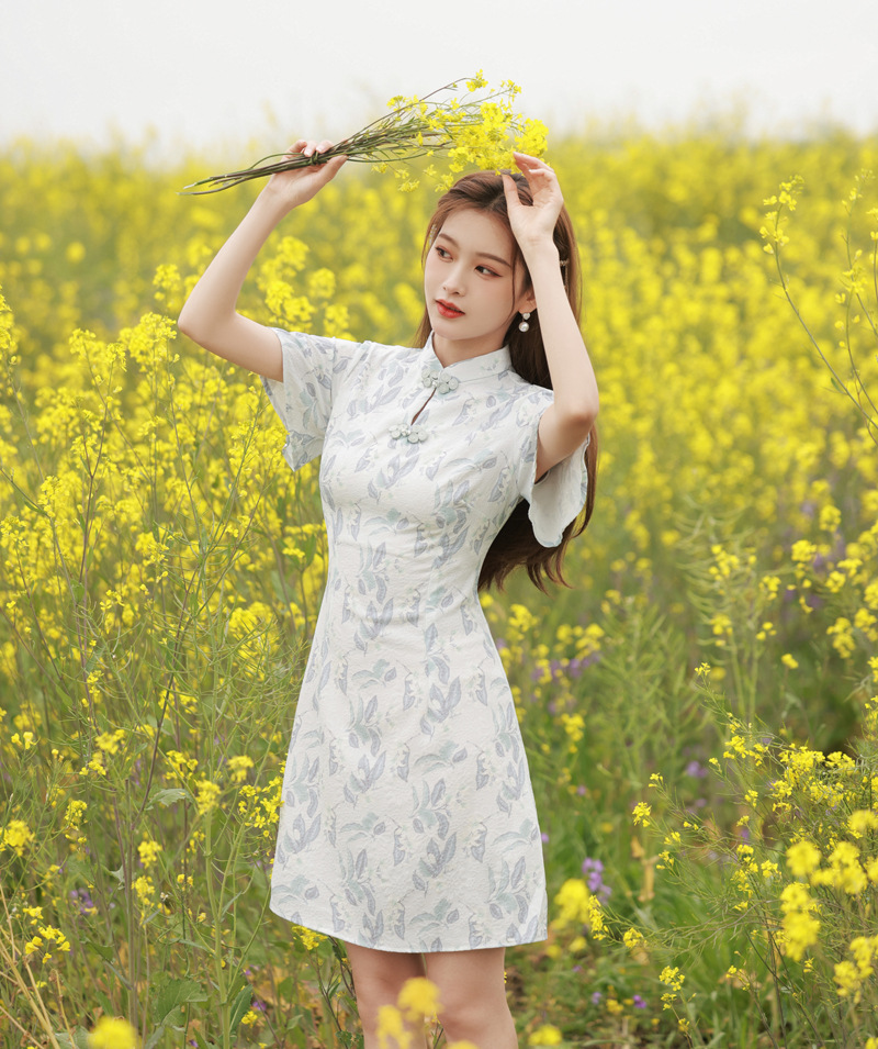 Gaun cheongsam ditingkatkan gaya Cina baru untuk anak perempuan musim panas elegan muda Lengan lipit musim panas 2023