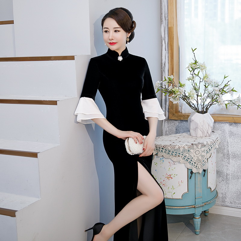 Gaun cheongsam lengan panjang retro gaya Cina, beludru dua lapisan lengan panjang 2023 musim gugur dan musim dingin baru
