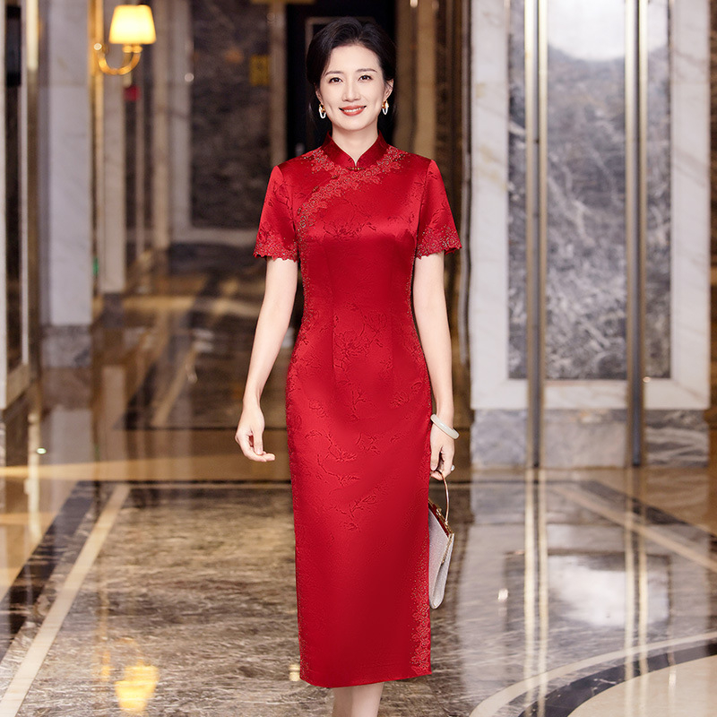 Cheongsam Modifikasi Panjang Sedang Jacquard Asetat High-end Gaun Pesta Pernikahan Ibu mertua Bordir Modis Model Baru Musim Panas 2025