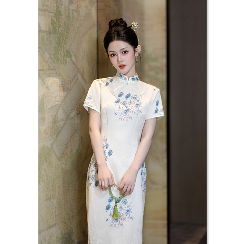 Gaun cheongsam panjang, gaun cheongsam panjang musim semi baru elegan harian ditingkatkan kinerja jamuan makan