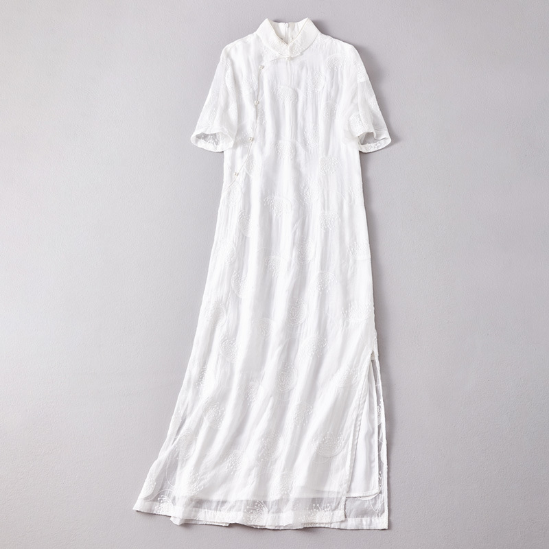 Tea Fu gaun lengan pendek, setelan teh cheongsam ao dai slim-fit China kerah berdiri Tencel bordir putih