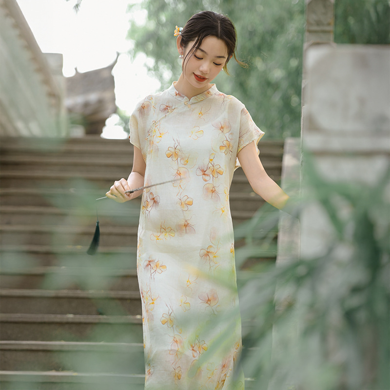 Pakaian Wanita Gaya Tiongkok Baru Rok Cheongsam Modifikasi Ramie Cetak Model Baru Musim Panas Gaun Terlihat Langsing Pelangsing Pinggang Gaya Tiongkok Grosir
