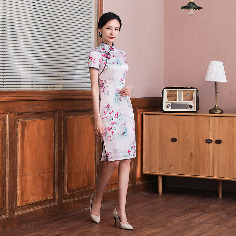 Cheongsam grosir 2024 musim panas kerah berdiri ramping gaun sutra murbei cetak gaya Cina retro gaun cheongsam 3711