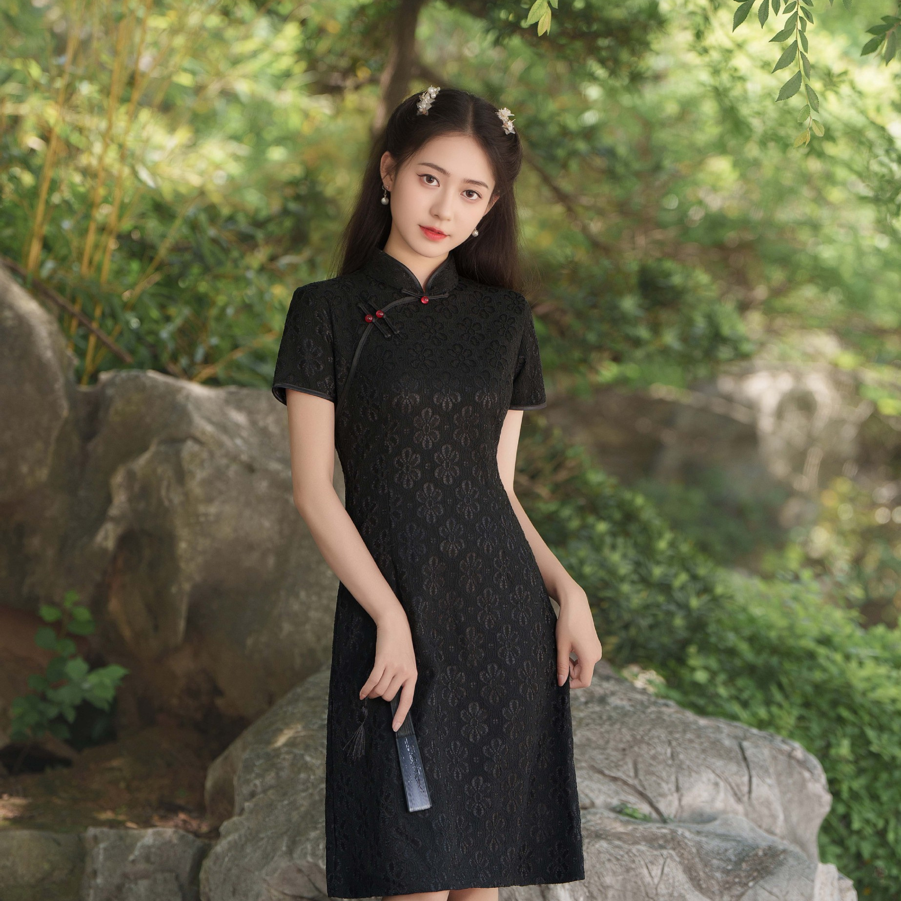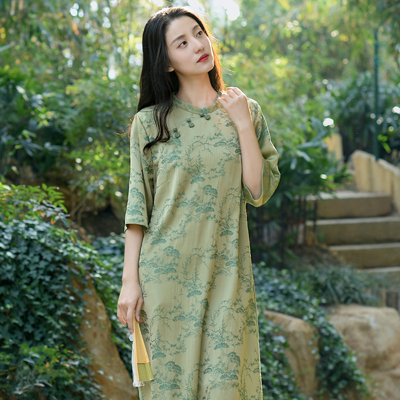 Gaun cheongsam komposit bergaya A, gaun harian cheongsam ramping setengah panjang Musim Panas 2024