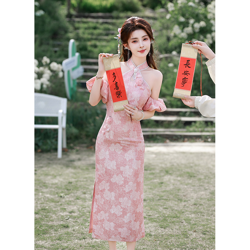 Cheongsam Bunga Gantung Leher Modifikasi Gaya Tiongkok Baru Warna Pink High-end Pakaian Bersulang Pakaian Pagi Pakaian Pernikahan Pengantin Wanita Gaun