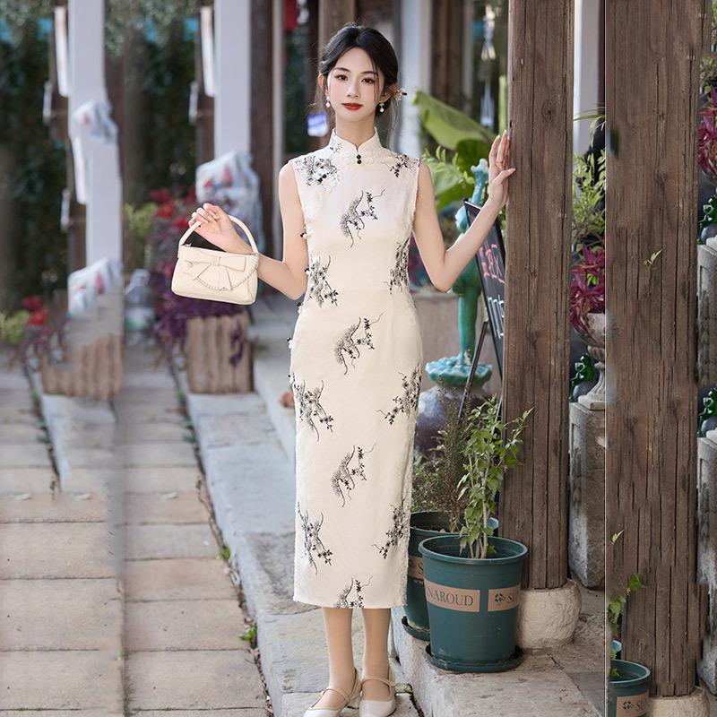 Cheongsam Modifikasi Model Panjang Gaya Tiongkok Tanpa Lengan Gaya Cina Tanpa Lengan Warna Putih Gaun Malam Retro Wanita Muda Model Baru 2025