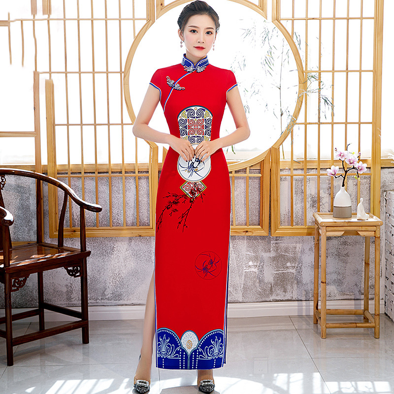 Pakaian Pertunjukan Paduan Suara Wanita Rok Panjang Kontes Lagu Merah Pakaian Panggung Upacara Selamat Datang Tuan Rumah Cheongsam Slim Fit