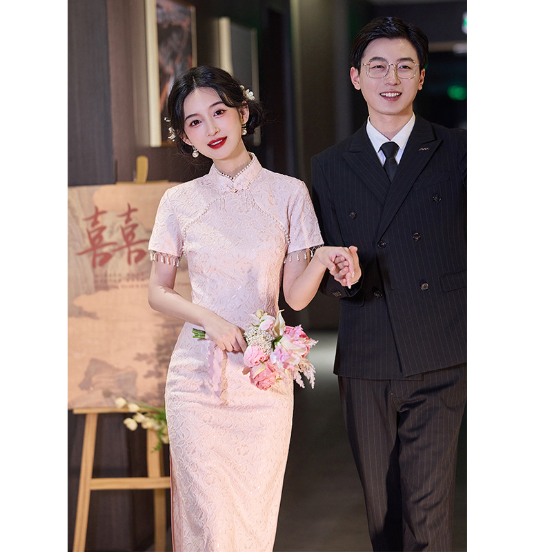 Cheongsam Merah Muda Pakaian Bersulang Pengantin Wanita Model Baru Musim Semi 2025 Gaun Pernikahan Gaya Tiongkok Baru Model Muda Diperbaiki