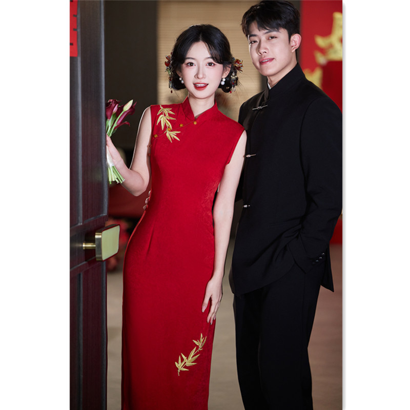 Cheongsam Merah Pakaian Bersulang Model Baru Musim Semi 2025 Cheongsam Bergaya Cina Baru Tanpa Lengan Cheongsam Kelas Atas Slim-fit