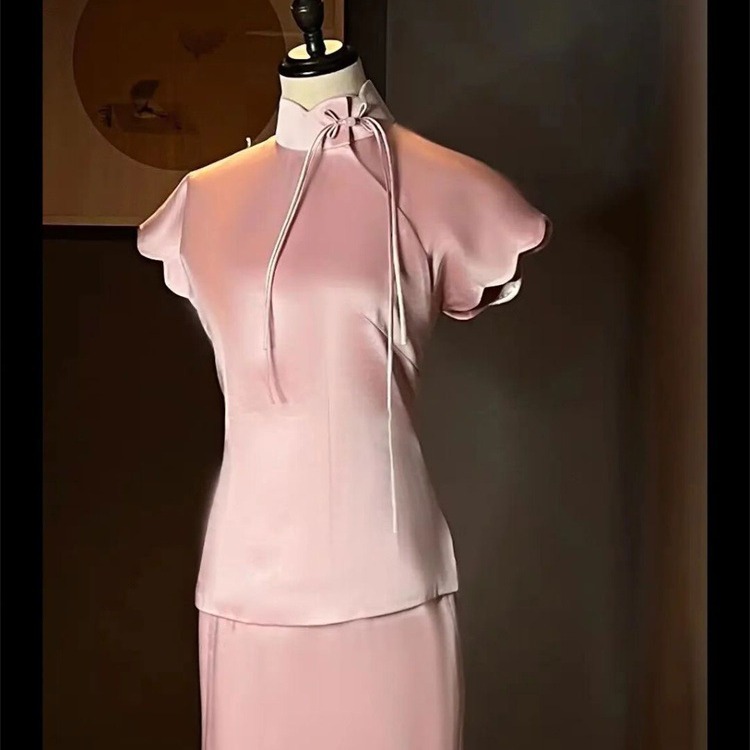 Merah muda 2024 musim semi/musim panas gaya Cina elegan ditingkatkan setelan cheongsam lembut set gaun pesta yang cocok untuk wanita