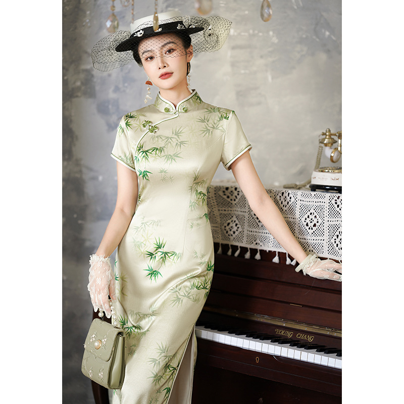 Gaun cheongsam sutra panjang Musim Panas 2024, gaun China ramping harian lengan pendek bermotif daun bambu panjang