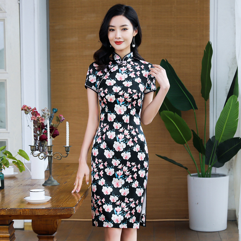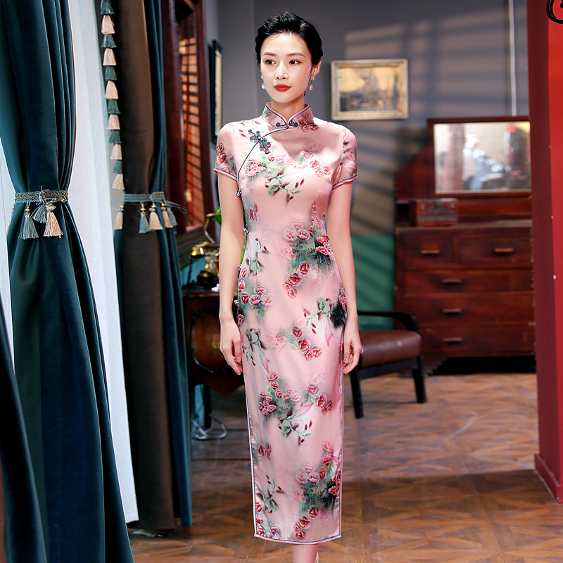 Cheongsam grosir 2022 musim panas sutra murbei panjang menengah retro ditingkatkan dicetak gaun cheongsam 3607