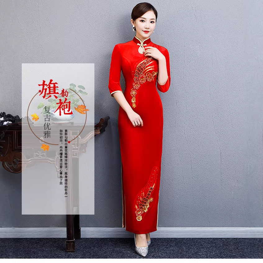 Gaun pesta pernikahan ibu warna merah elegan model cheongsam beludru untuk musim panas, gaun pertunjukan panjang dengan lengan sedang.