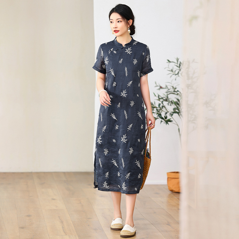 Ramie dress bordir cheongsam ditingkatkan, pakaian wanita desain asli kelas atas artistik klasik kerah berdiri lengan pendek gaun bordir